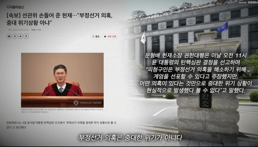 부정선거 의혹이 커지지만 헌법재판소는 중대 위기상황이 아니라고 판결함.