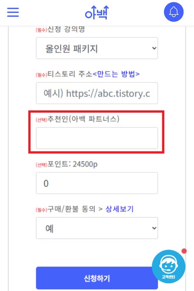결제 단계에서 '추천인 코드' 입력란이 나옵니다.