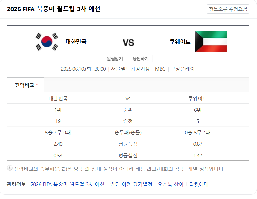 | 2025.06.10 | 오후 8시 | 대한민국 vs 말레이시아 |